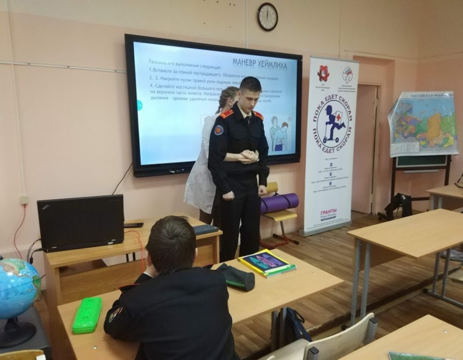 Ребята учились правильно определять площадь, степень и виды ожоговых поражений кожи, разобрали алгоритм действий при оказании первой помощи пострадавшему, что стоит незамедлительно делать и что категорически запрещается, чтобы не усугубить ситуацию. Изучили маневр Хеймлиха, который прост и эффективен и может спасти жизнь человеку при поперхивании. Особенность занятия заключается в том, что лектор, опытный врач-реаниматолог Ксения Юрьевна Цветнова, уже более 5 лет спасающая жизни, кроме теоретических знаний, сконцентрировала внимание ребят на практических навыках. И в этом ей помогал ординатор больницы – молодой доктор. Каждый ученик стал участником сцены спасения своего одноклассника и просто школьного друга, выполнив эффективный прием оказания экстренной медицинской помощи, используемый для освобождения дыхательных путей человека от застрявшей в них пищи или другого инородного предмета, вызывающего удушье.