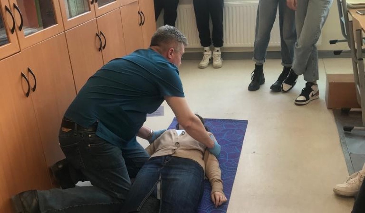 27 марта в школе №1514 профессиональный хирург, прошедший специальную подготовку по оказанию первой помощи людям, попавшим в беду в рамках социально-значимого проекта «Скорая в пути» Константин Владимирович Петрушин, провел занятие для девятиклассников по теме – оказание помощи при отсутствии пульса и сознания.